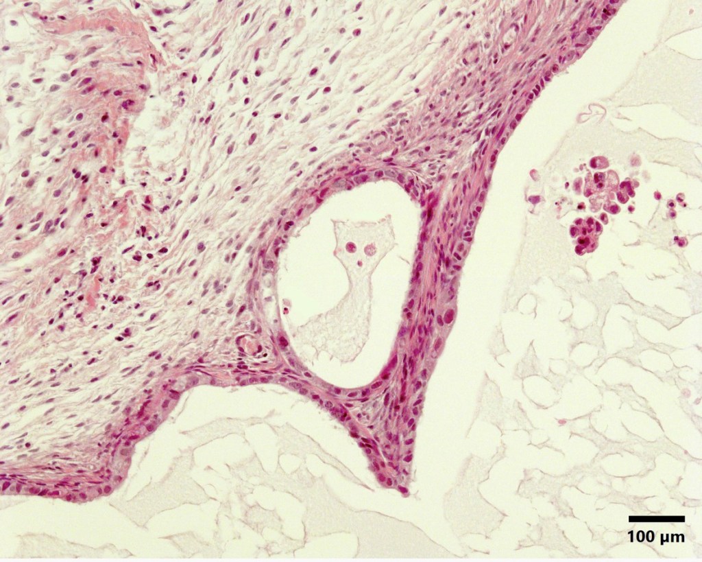 Hematoxylin and Eosin stain of experimental human endometriosis in an immunocompromised mouse. Original magnification, 200x. Bruner-Tran laboratory, 2023.